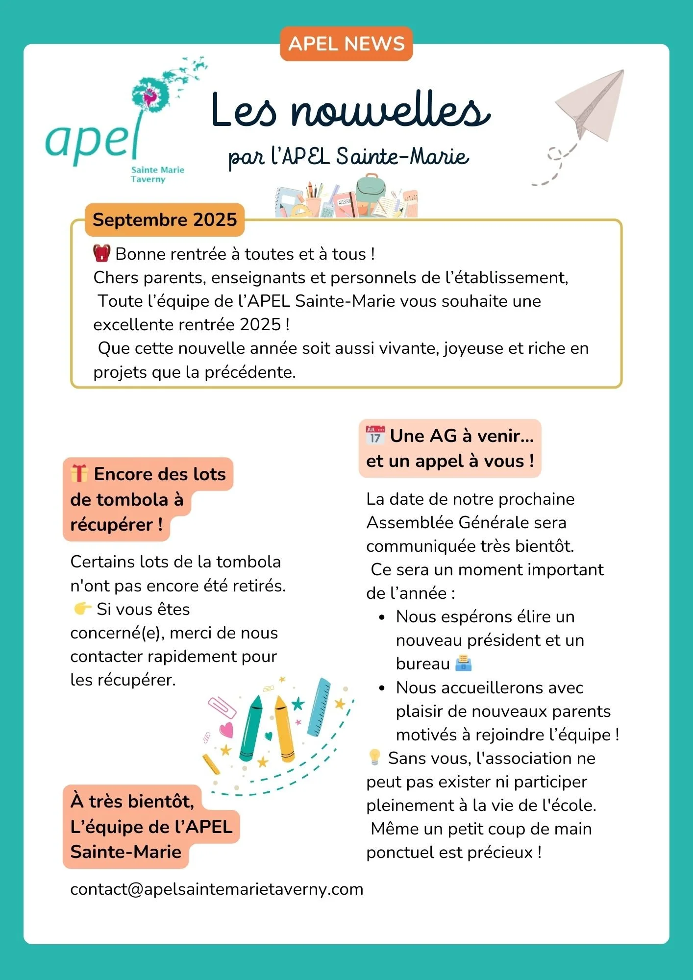 Au cœur de notre communauté éducative, l'APEL Sainte-Marie se dédie à enrichir l'expérience scolaire de nos enfants. Nous sommes une équipe de parents engagés, travaillant main dans la main avec l'établissement pour soutenir, innover et célébrer chaque étape de l'éducation de nos jeunes.